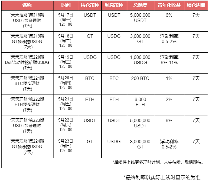 《Gate.io“天天理财”第218期 USDT锁仓理财》将于5月17日(明日)中午12:00上线,总额度5,000,000 USDT,锁仓期限7天,年化收益率 6%。