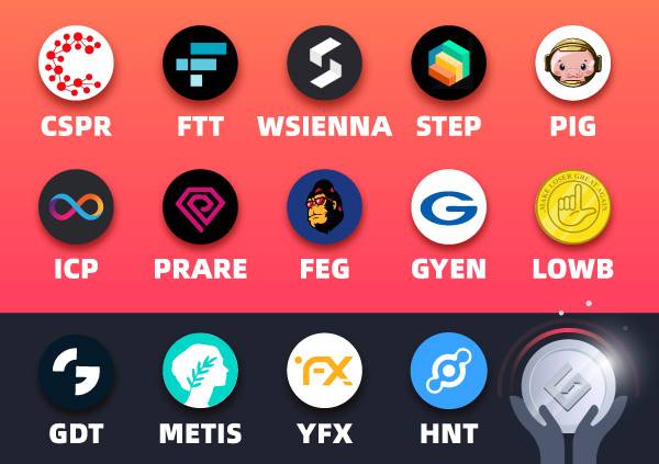 本周期我们陆续上线CSPR、FTT、WSIENNA、STEP、PIG、ICP、PRARE、FEG、GYEN、LOWB、GDT、METIS、YFX、HNT交易并开通提现服务。