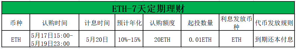 主流币跌跌不休,理财稳稳收益!天天理财第四期惊喜上线!7天ETH定期理财,预期最高年化收益15%!活动详情如下: