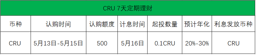 1、净充值(充值-提现)不低于0.5 CRU;为防止恶意注册刷量,充值后需在活动期间4天内需持续持仓(不可提币) 或 卖出后持仓40 U等值资产。