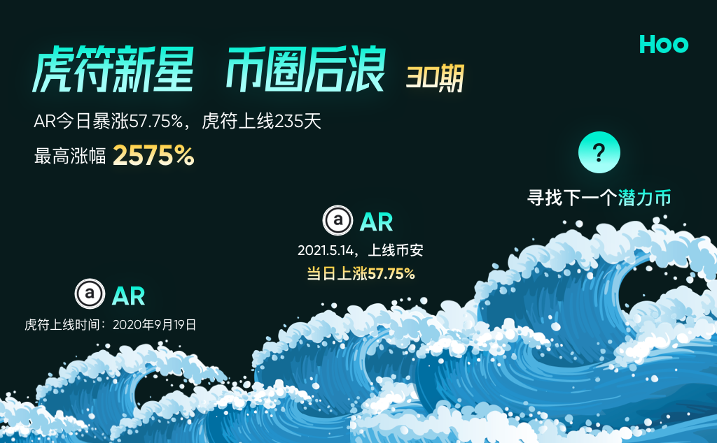 2021年5月14日,AR项目上线币安,当日上涨57%,而该项目于2020年9月19日上线虎符平台以来,最高涨幅达到2575%