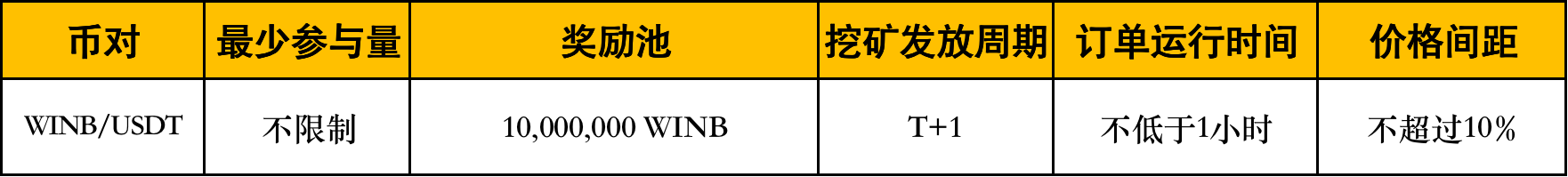 活动规则:活动期间,用户通过网格宝开启WINB/USDT网格交易,满足条件即可获得网格 流动性挖矿双收益,一键双挖,流动性挖矿奖励池为10,000,000 WINB,将根据用户提供流动性的占比瓜分奖励池,收益为基准货币,例如开启WINB/USDT币对网格交易并满足挖矿条件,则每日挖矿收益为WINB。