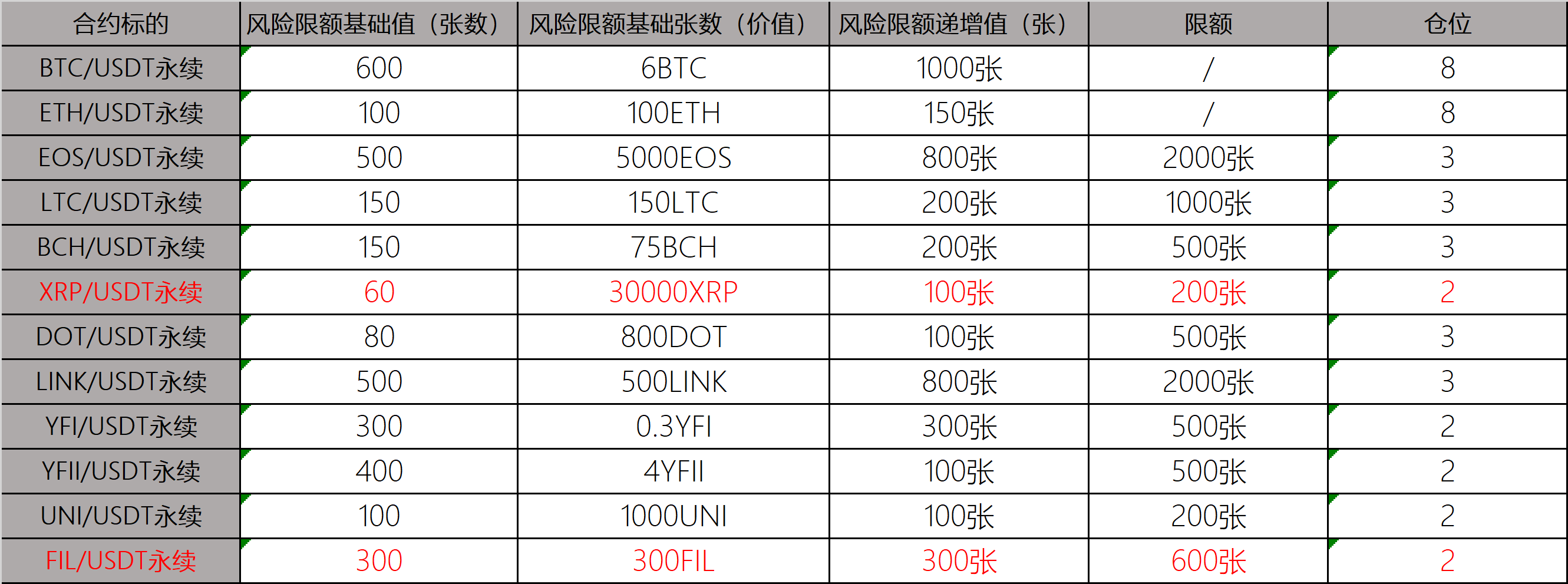 BMEX风险限额将于2021年4月12日17时(UTC 8)进行调整,此次调整交易对为XRP/USDT和FIL/USDT。请关注仓位情况,在调整前及时添加保证金或进行平仓,以免发生不必要的损失。详情如下: