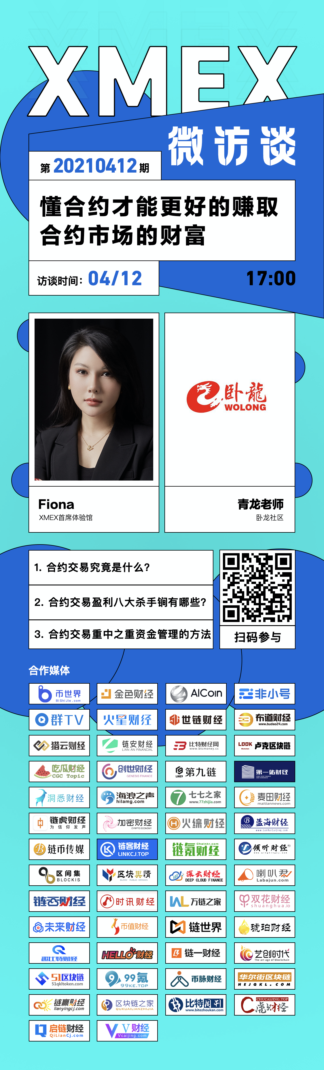 XMEX微访谈第【20210412】期将于4月12日17:00开启。本期分享嘉宾“青龙老师”多年从业金融投资圈,擅长趋势判断,拥有丰富的数字资产合约经验和专业的技术分析能力。访谈中青龙老师将为XMEX社群用户详细解读合约交易的本质与合约交易盈利八大杀手锏,畅谈合约交易中重要的资金管理的方法。