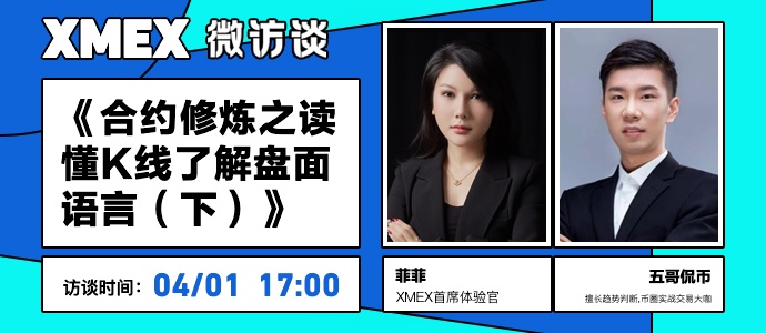 XMEX微访谈第【20210401】期将于4月1日17:00开启。本期分享嘉宾“五哥侃币”是微博知名KOL,多年从业金融投资圈,擅长趋势判断,他将继续为社群用户详细讲解K线的基础知识、形态结构、案例分析和实战演练,将全面提升社群用户的看盘能力。