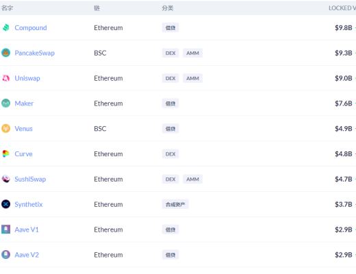 DeFi项目锁定资产前十排名及锁仓量,数据来源:Debank