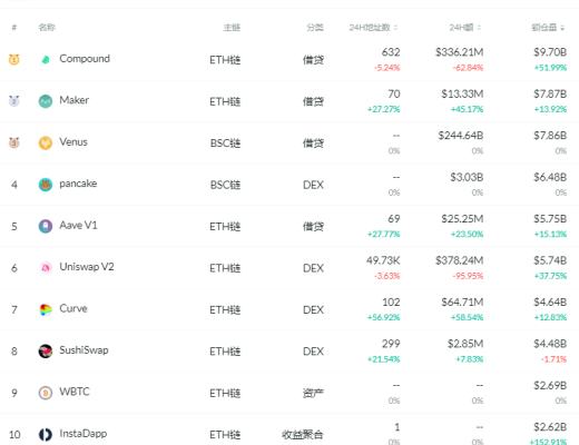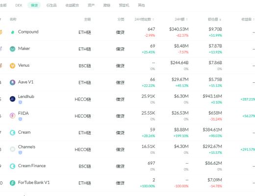 锁仓量排名前十的借贷平台 排名来源:DeFibox
