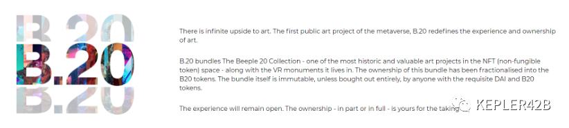 人们还可以将一系列资产的所有权碎片化。Metakovan用B.20代币做到了这一点,它包含28个资产,包括Beeple的cryptoart和Cryptovoxels、Decentraland和Somnium Space中的数字土地。