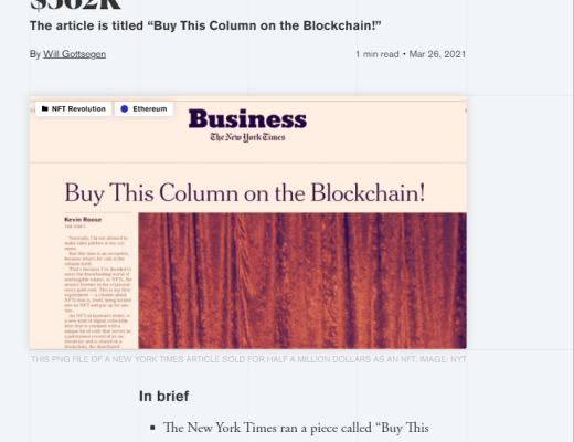 拥有书面内容也可以为出版商提供一种新的商业模式。例如,《纽约时报》(New York Times)一篇专栏文章的NFT最近以56万美元的价格售出,很可能远高于该公司通过这篇文章的广告收入。