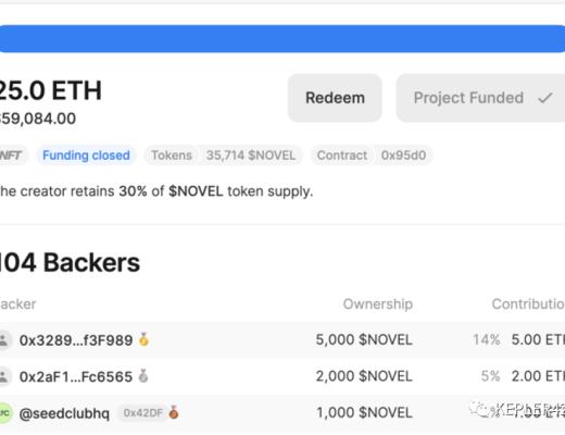 例如,一位名叫Emily Segal的作家能够为她的下一部小说众筹5万美元(25 ETH),以$novel代币的形式分发70%的作品,这代表了NFT的部分所有权。在此书的致谢中有提到,如果NFT在二级市场上以更高的价格出售,104美元的NOVEL代币持有者有权按比例分享利润以及其他好处。