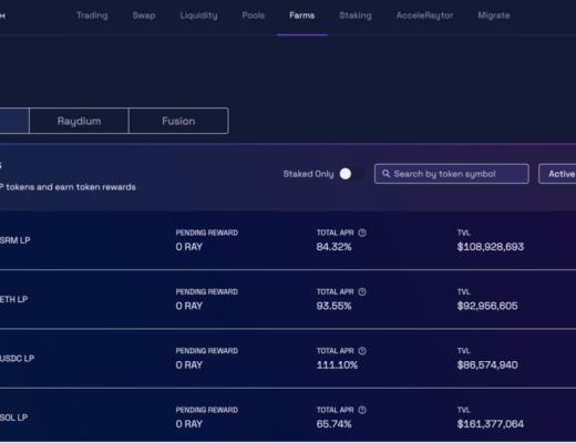 Raydium是Solana上最大的AMM,有超过13.5亿美元的价值被锁定,每天的交易量超过2.2亿美元。Raydium是独一无二的,因为它为Serum提供流动性,这是一个基于Solana的中央限价订单簿(CLOB)DEX。这意味着交易者可以在任何一个协议中获得流动性,为他们的交易获得最低的滑点,而LP可以通过Serum的交易量提高他们的回报。