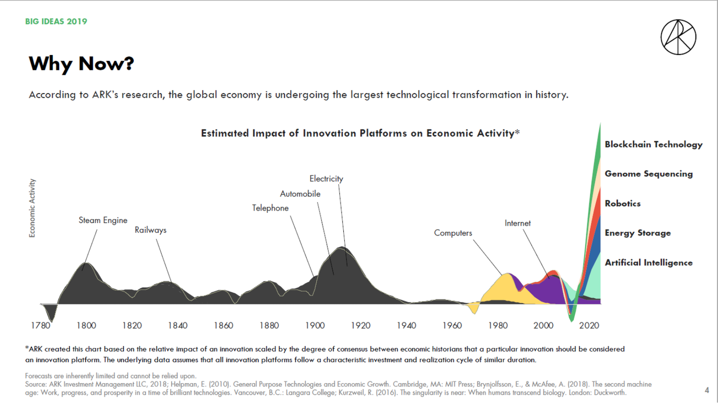 与我们的Crypto文艺复兴理论(Crypto将有助于迎来与14世纪文艺复兴期相似的新时代复兴)类似,木头姐认为,未来10-20年人类将迎来历史上最大的技术变革期。