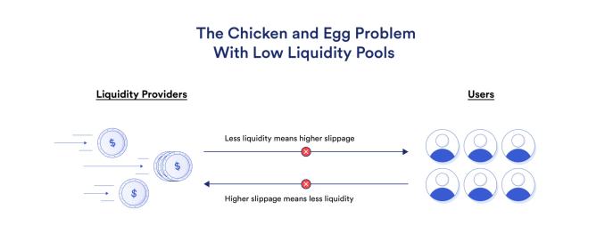 这就导致了鸡和蛋的问题。如果没有足够的流动性,掉期引起的滑坡会使用户不愿意参与DeFi协议的生态系统。如果没有用户通过代币交易参与,就没有足够的费用量产生,以激励第三方行为者汇集他们的代币并提供流动性。