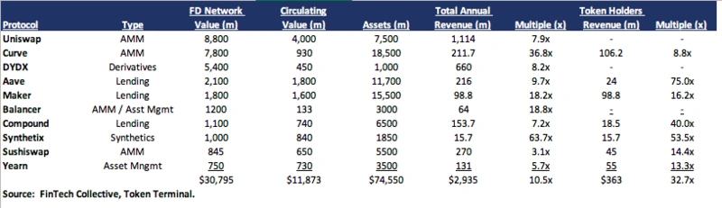 DeFi 网络价值和协议收入 - 目前排名前 10 位的 DeFi 协议的 FD 网络总价值为 310亿美元。 据我估计,他们在链上产生了29亿美元的年化收入,其中 3.65 亿美元左右作为抵押红利(sushi)流入代币持有者或间接燃烧(MakerDAO)。 是的,大部分收入确实流向了流动性提供者。 但是 10.5 倍的 FD 价值 / 收入倍数和 32.7 倍的流通价值 / 代币持有者收益倍数并不昂贵,而且对于同比增长 20 倍的东西来说,它被严重低估了。