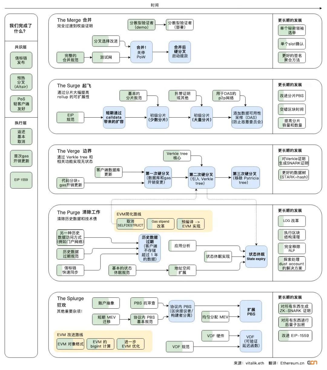 合并后的升级则更多地针对可扩展性和效率的改进。在今年 7 月的以太坊巴黎会议,Vitalik 开玩笑称,以太坊的道路先是“merge(合并)”,再是“surge”、“verge”、“purge”和“splurge”。surge 就是计划列表中的下一步,它指的是“分片(sharding)”,即将数据库拆分为片状以分散负荷。这使得以太坊可以处理更多的交易,还能减少使用它的费用。“现在的以太坊每秒可以处理 15 至 20 笔交易。未来的以太坊……将能够每秒处理 100,000 笔交易,”Vitalik 宣称。