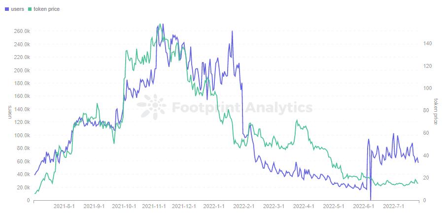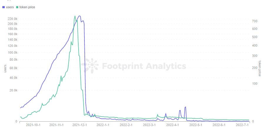 Axie Infinity 作为 Play-to-earn 的鼻祖,其背景、资源、玩家共识都是当期的其他链游无法匹敌的。因此它在仅有基础双币模型和繁殖系统的情况下,依然能保持几个月的上升期,在之后也是缓慢下跌,至今仍有一部分忠实用户。