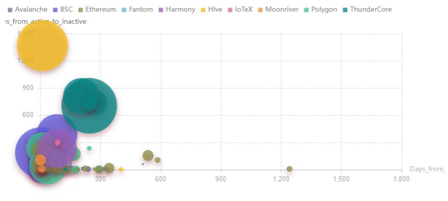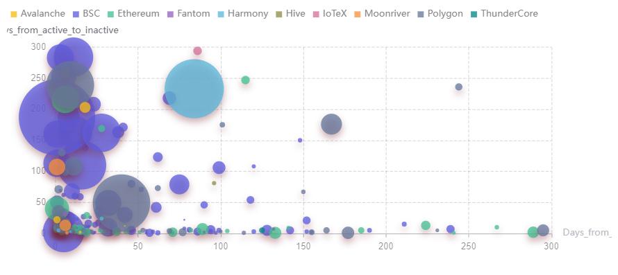 通过对 GameFi 项目从上线到活跃再到走向不活跃的周期分析,将横轴设定为项目从上线到活跃状态所需的天数,纵轴为从处于活跃状态的天数,气泡的大小为总用户数。