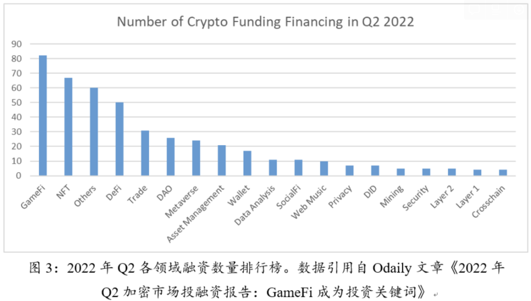 下面回顾一下投资机构在之前关注什么领域。如下图所示,在Q2,全球加密投资机构最关注的领域为GameFi 和NFT。游戏、游戏相关的基础设施和及技术解决方案共获得了 82 笔融资,在数量上排名第一,占融资总数量的 16%。GameFi领域的融资金额同样遥遥领先,高达 29.96 亿美元,占全行业融资总额的 23.5%。NFT 领域共获得 67 笔融资,数量上位列第二。DeFi以50笔融资数量排在第四位。以L1、L2、矿业、隐私、身份等为代表的基础设施领域成为了“长尾领域”,它们获取的投资笔数均在10笔左右。