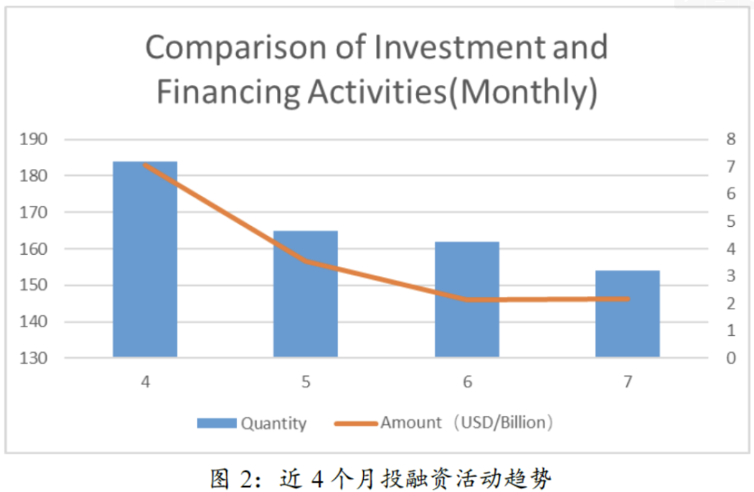 不过如果以月为单位来看,我们却感受到了一丝凉意。从4月到7月,投融资活动的数量和金额在单调下降。4个月间投融资总金额下降了近70%,数量下降了16%。投融资市场冷清的状态基本与我们访谈的投资人的心理状态相符。