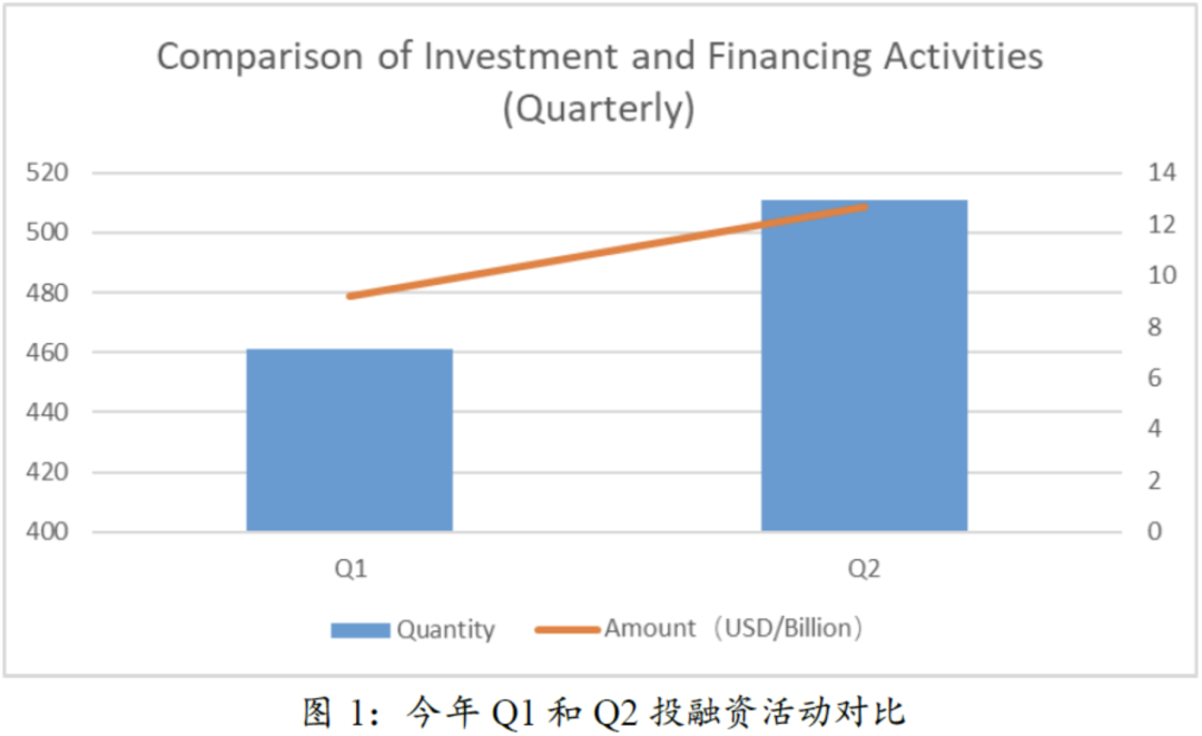 与今年第一季度做对比。今年Q1全球加密市场共发生 461 起投融资事件,已披露总金额为 92 亿美元。尽管在Q2加密二级市场环境更加恶化,但是投融资活动却有了回暖的迹象。投融资活动的数量环比上升了11%,金额环比上升了38%。
