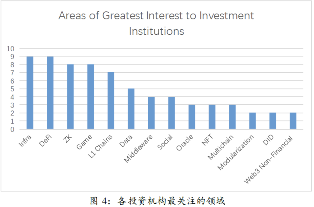 调研结果显示,各家机构对基础设施的关注程度明显高于应用类。部分机构没有明确提出“Infra”这个词,但是他们的关注点还是落在了如ZK、新公链领域。本文为了讨论方便,将零知识证明、新公链、中间件、DID、数据、模块化等领域都归类到基础设施中。