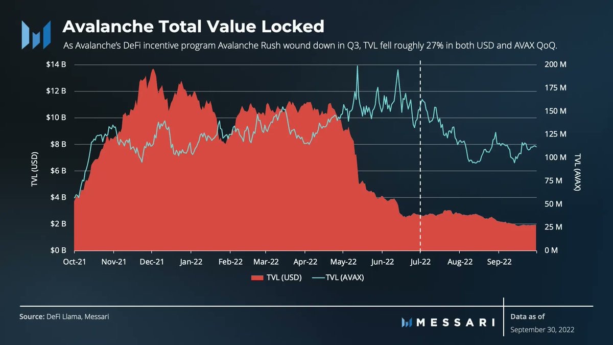 同样,Avalanche DeFi激励计划Avalanche Rush也一直在下滑,其TVL在美元和AVAX季度环比 (QoQ) 中损失了大约27%。