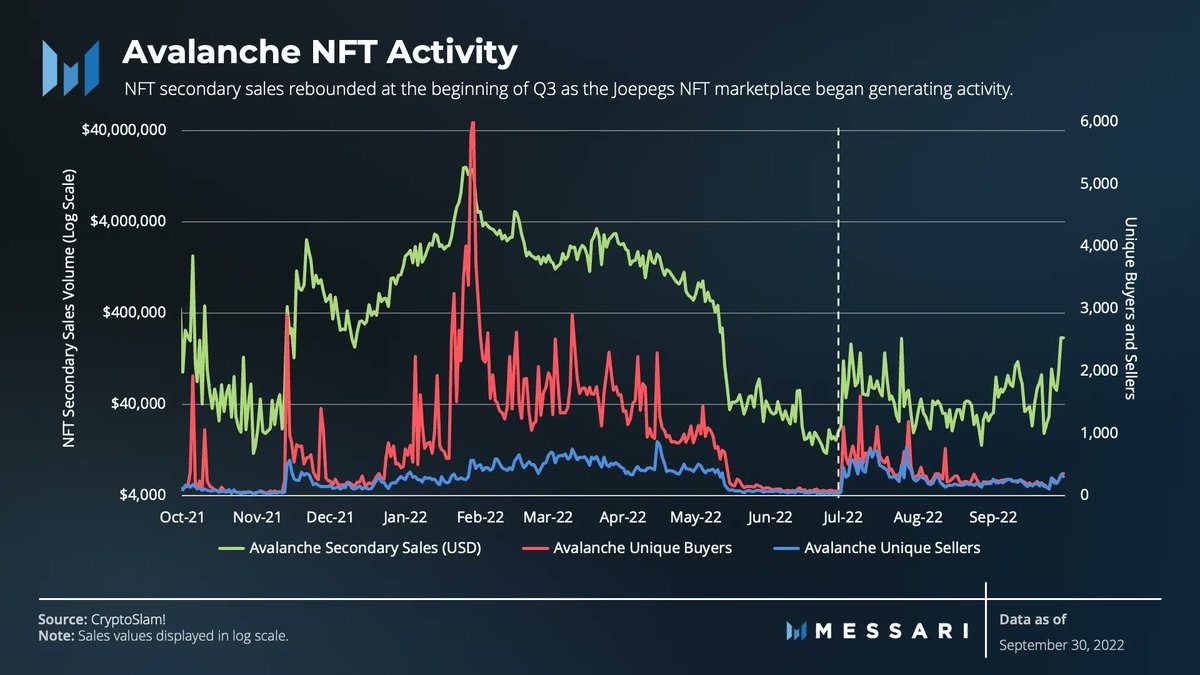 除DeFi外,Avalanche NFT市场状况也不佳,其NFT销量和独立买家地址数分别下降了88%和34%以上。然而,根据Messari提供的数据,独立卖家增加了25%。每日活跃地址平均每天38,000个,低于第二季度的平均63,000个。
