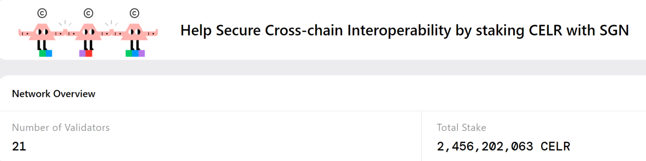在此基础上,cBridge通过SGN(一条PoS链)来为跨链信息验证提供保障。SGN上的节点(即验证者)通过质押CELR来参与验证,作恶或者掉线都会受到惩罚。整个机制比较安全。目前SGN上总共有21个验证者参与交易验证,质押CELR数量超过24亿枚。