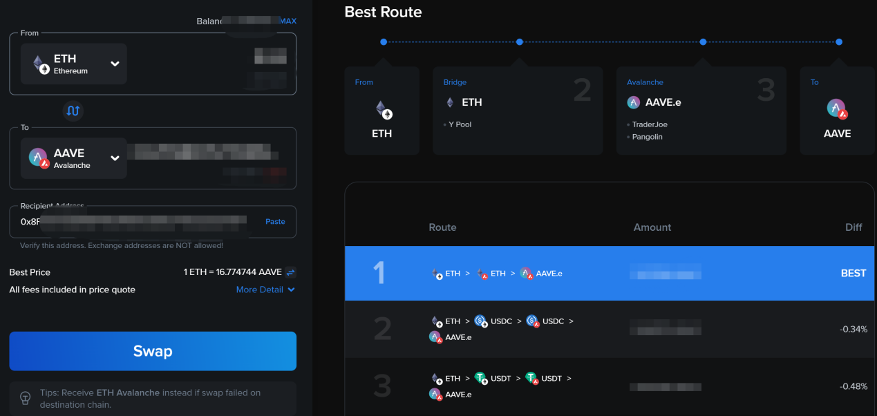在这些跨链桥界面,用户选择跨链/swap资产、原链、目标链后,平台会向用户展示多个路由,并根据gas费、跨链时间等给出路由排序,用户能比较方便地选择最佳跨链方案。
