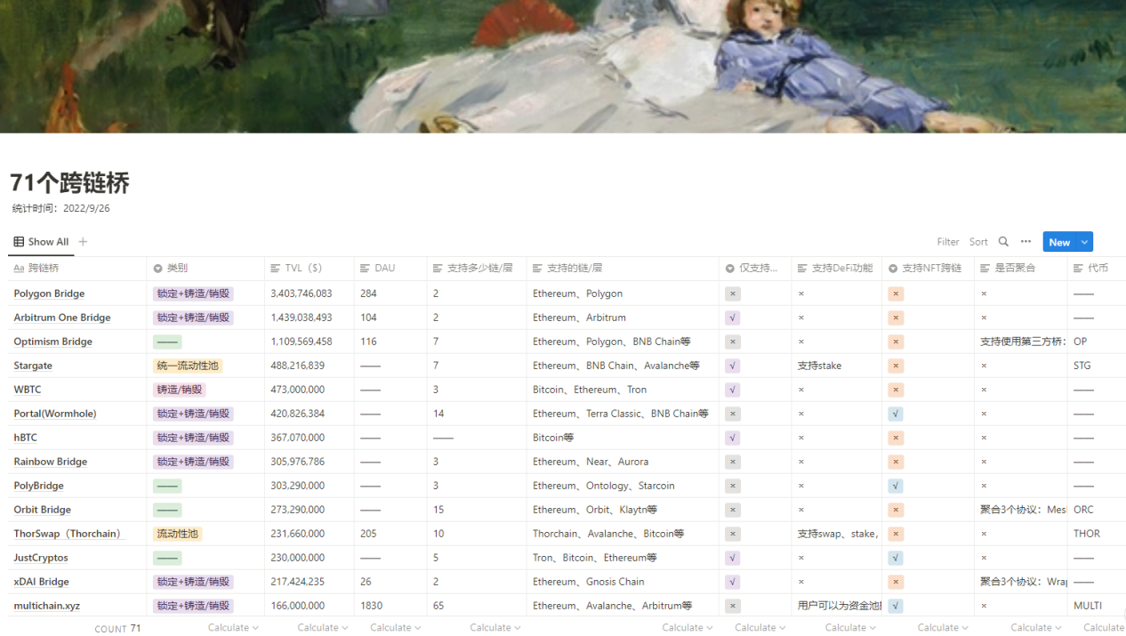 哔哔News对71个跨链桥做了统计。在这篇研报中,我们将从跨链生态现状、技术方案、趋势和机会3个维度对跨链生态进行最全面的梳理和解读。