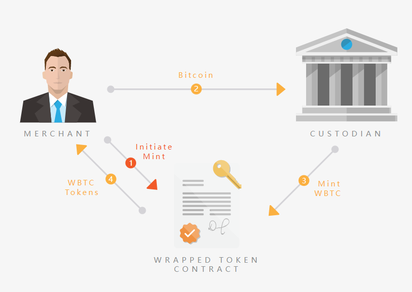 WBTC是典型的锁仓+铸造/销毁类跨链桥。用户要把BTC跨链到以太坊网络,他需要向承兑商请求WBTC。承兑商先对用户进行KYC/AML验证,然后把用户的BTC交给托管机构托管,托管机构和承兑商执行WBTC铸造,承兑商再把WBTC返还给用户。