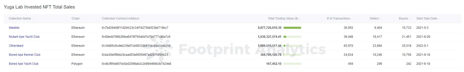Yuga Lab’s Portfolio (Data source: Footprint Analytics)