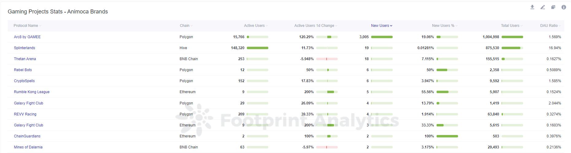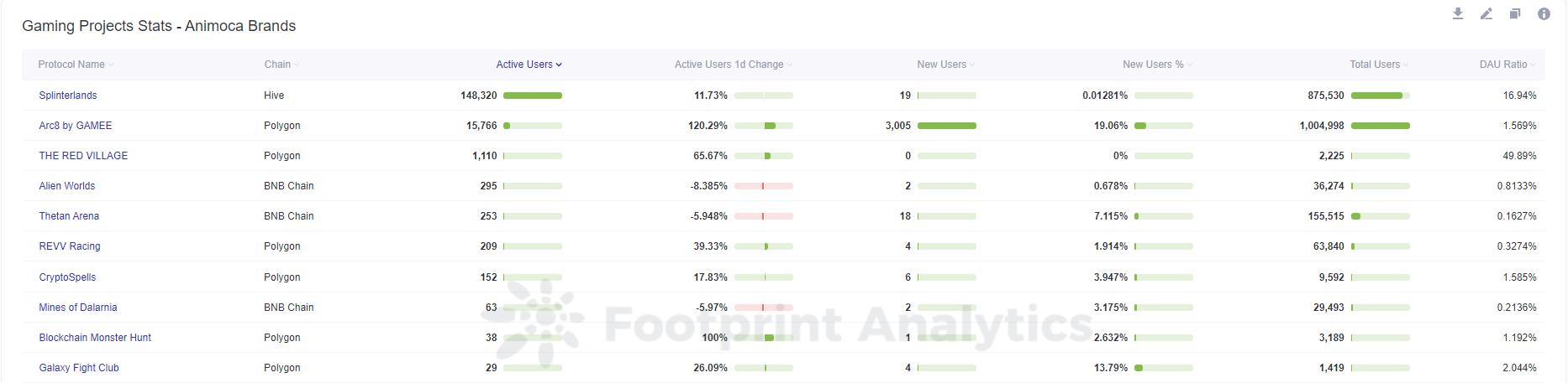 Gaming Projects Stats - Animoca Brands (Data source: Footprint Analytics)