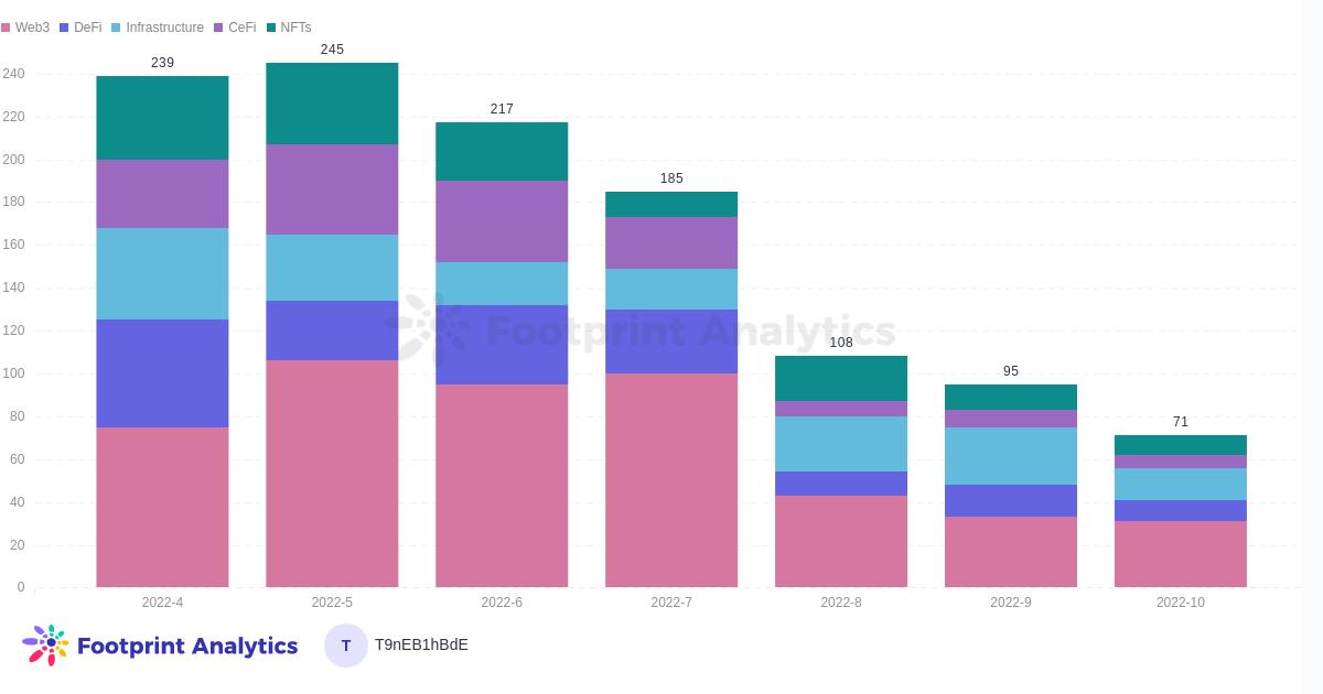 这种资金的下降并不是 GameFi 特有的,整个区块链行业的资金都在持续下降。