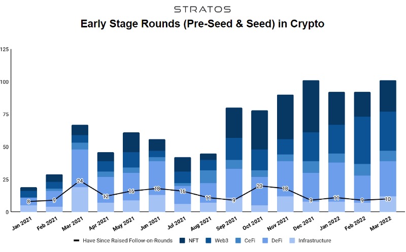其中,从2021年初到2022年3月,早期阶段将近1000轮,DeFi是最受欢迎的类别,其次是NFT、Web3、基础设施、CeFi。
