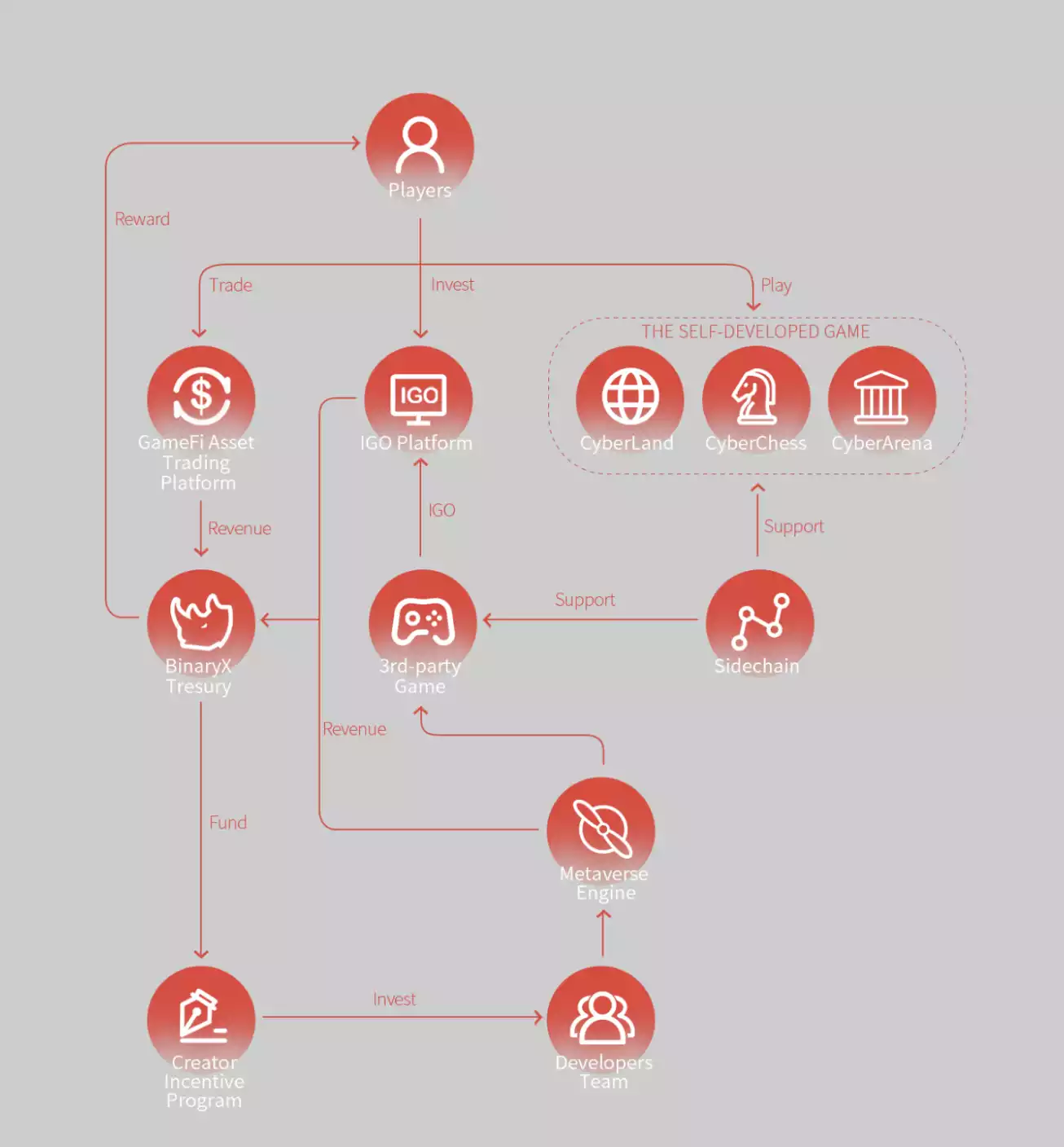在完成了 BinaryX 财库的构建后,BinaryX 将建立以自研游戏、IGO 平台、BinaryX 财库为基础的初始生态循环。
