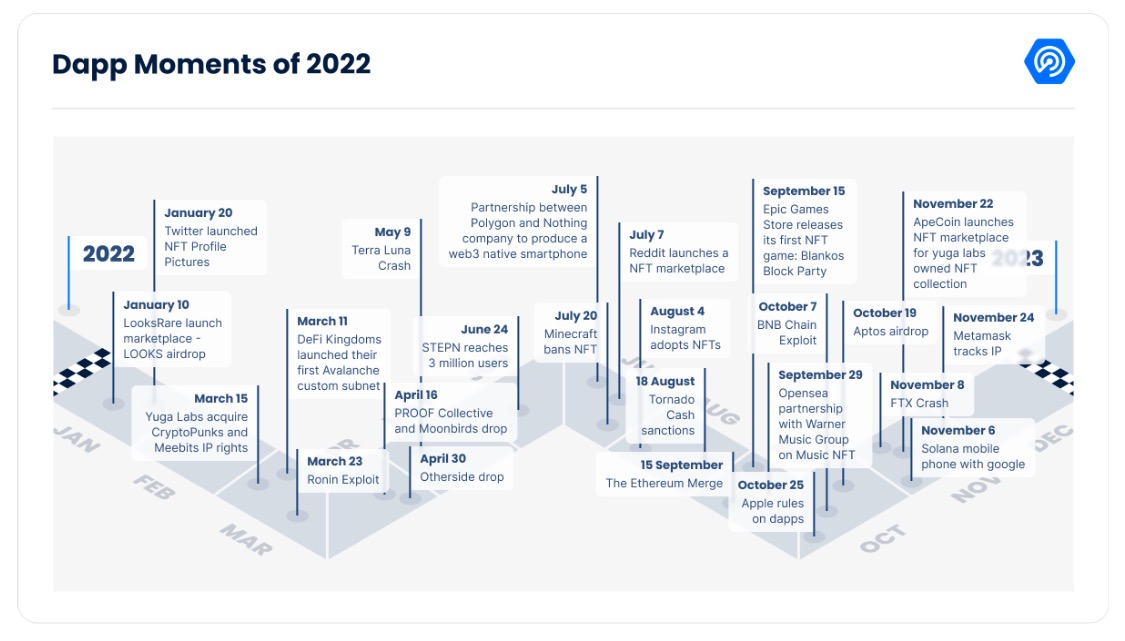 DappRadar 2022年也提到了黑客、盗窃和rug pulls。总共312次攻击导致全面损失487.4亿美元,创下2009年比特币问世以来的最高纪录。