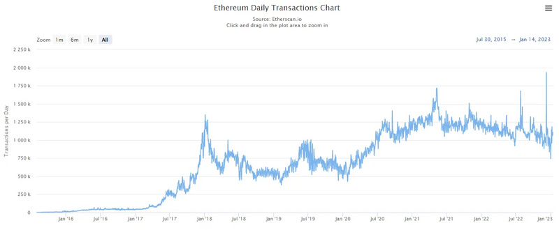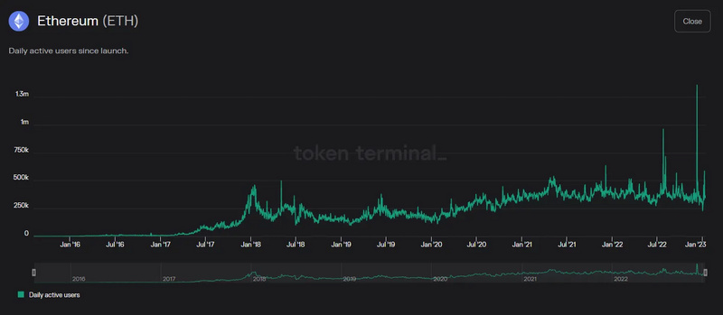 以太坊的收入数据仍然保持强劲。在过去 30 天里,该网络的日均销售额约为 260 万美元。过去 6 年的复合年增长率为 454% 。如果我们从较为活跃的 2017 年开始, 5 年期间的复合年增长率为 146% ——即使 2022 年与 2021 年相比下降了 58% 。
