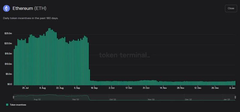 上图是 9.16.22 - 1.15.23 合并后的数据。我们想强调自合并以来流量的巨大变化。在合并之前,当以太坊基金会疯狂地过度支付其矿工时,该网络每天发行约 13, 500 个新的 ETH。使用今天的 ETH 市场价格,每天新增供应量约为 2092.5 万美元。此外,矿工有运营成本(硬件 + 电力),因此出售了大约 80% 的奖励。
