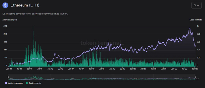 在过去 6 年中,以太坊开发人员的复合年增长率为 32% 。我们正在监测最近的下降情况,但认为这主要是季节性的。有趣的是,代码提交数年来一直持平,比早年有所下降。这是由于可组合的开源代码的力量——每个问题被解决一次,允许其他的在上面构建——有点像乐高积木相互链接。