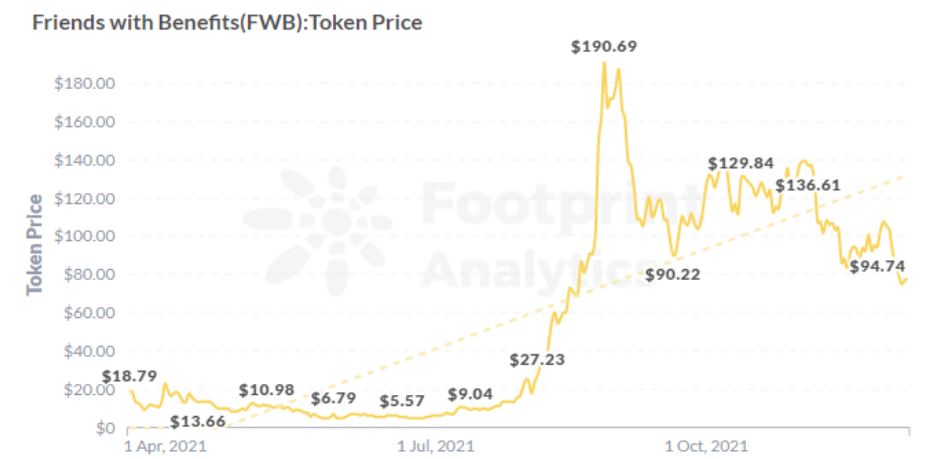 从 FWB 和 RLY 的走势图来看,当年分别都有一些 ups & downs,Footprint Analytics 数据显示,FWB 价格从 17.69 美元一路飙升至 190.69,增长 977%;10 月,再获 a16z 投资。但是 FWB 和 RLY 等类似的项目均在 10 月以后趋于冷清,在 2022 年上半年更是一路打回原形,曾经的光芒已然不在,2022 年开启了新的社交叙事。