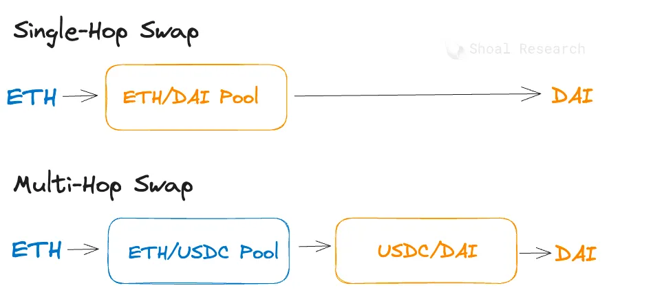 当使用 AMM 进行交易时,有两种交换类型:单跳交换(Single-Hop)和多跳交换(Multi-Hop)。单跳交换是一种简单的交易路线,通过一个池将代币 A 直接交换为代币 B。另一方面,多跳交换需要将交易路由到多个池中。只有在无法使用单跳交换来填补订单时,才会执行多跳交换,因为单跳交换产生的 Gas 费用要少得多。大多数 AMM 的结构是每个池子都有自己的智能合约,这使得在多个池子之间执行多跳交换会使用非常多的 Gas。