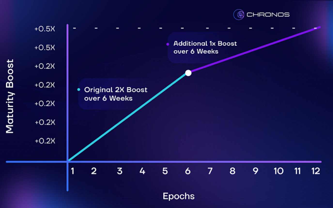 Chronos 也有一个可以赚取协议费用的 NFT 集合:chrNFT,但与 Thena 的不同之处在于其到期调整回报(Maturity-Adjusted Return),这样流动性提供者提供流动性的时间越长,就能获得更多的排放奖励。