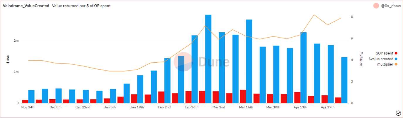 Velodrome 是唯一一个通过 OP 捐款形式获得其 OP 链支持的 Solidly fork,赠款被用于他们精心设计的激励计划:Tour De OP。该激励计划的结果就是,每花费 1 美元的 OP 就会为流动性提供者和 veVELO 投票者带来 8 美元的价值,致使 Velodrome 能够在 6 个 forks 项目中达到最高的 TVL。