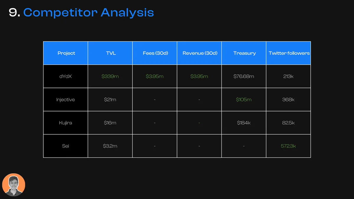 尽管在总锁定价值(TVL)和收入方面,dYdX 是明显的领导者,但 Injective 拥有庞大的资金库和一些重量级机构的支持。为了确保与强大的竞争对手保持同步,Injective 必须继续创新。