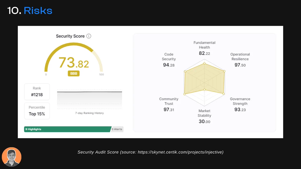 该项目已经通过审计,并获得了 CertiK 的 73.82 的安全评分。它在代码安全性、基本健康状况、运营弹性和治理实力方面得分非常高(前 10%)。然而,在市场稳定性方面,它的得分排在最后 5%。