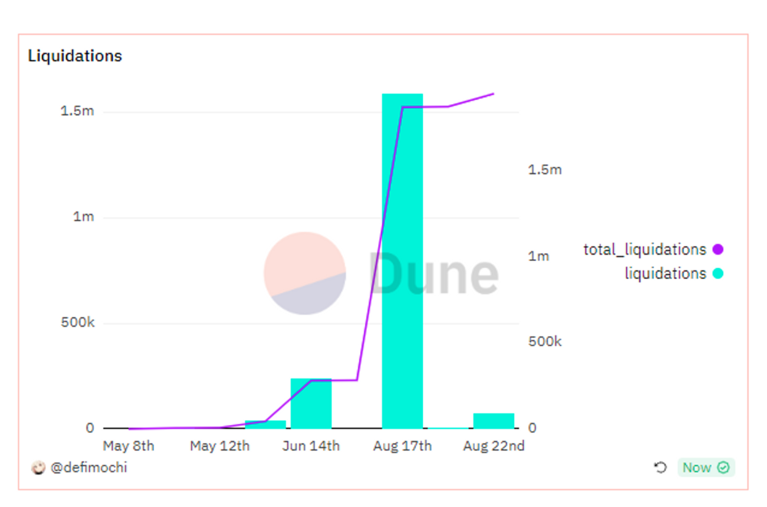 在 dune 中的数据显示,协议曾于 8 月初至 8 月 17 日发生大额清算,清仓 1.58M,总历史清算规模 1.87M。