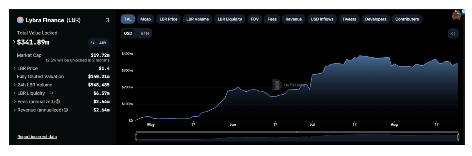 8 月 25 日笔者进行估值,在估算时,根据 Defilama 的数据显示,币价 $1.4,流通市值 19.72M, FDV140M。Lybra 的 Fee 和 Reveue 为 2.64M(以近一个月的收入乘以 12)