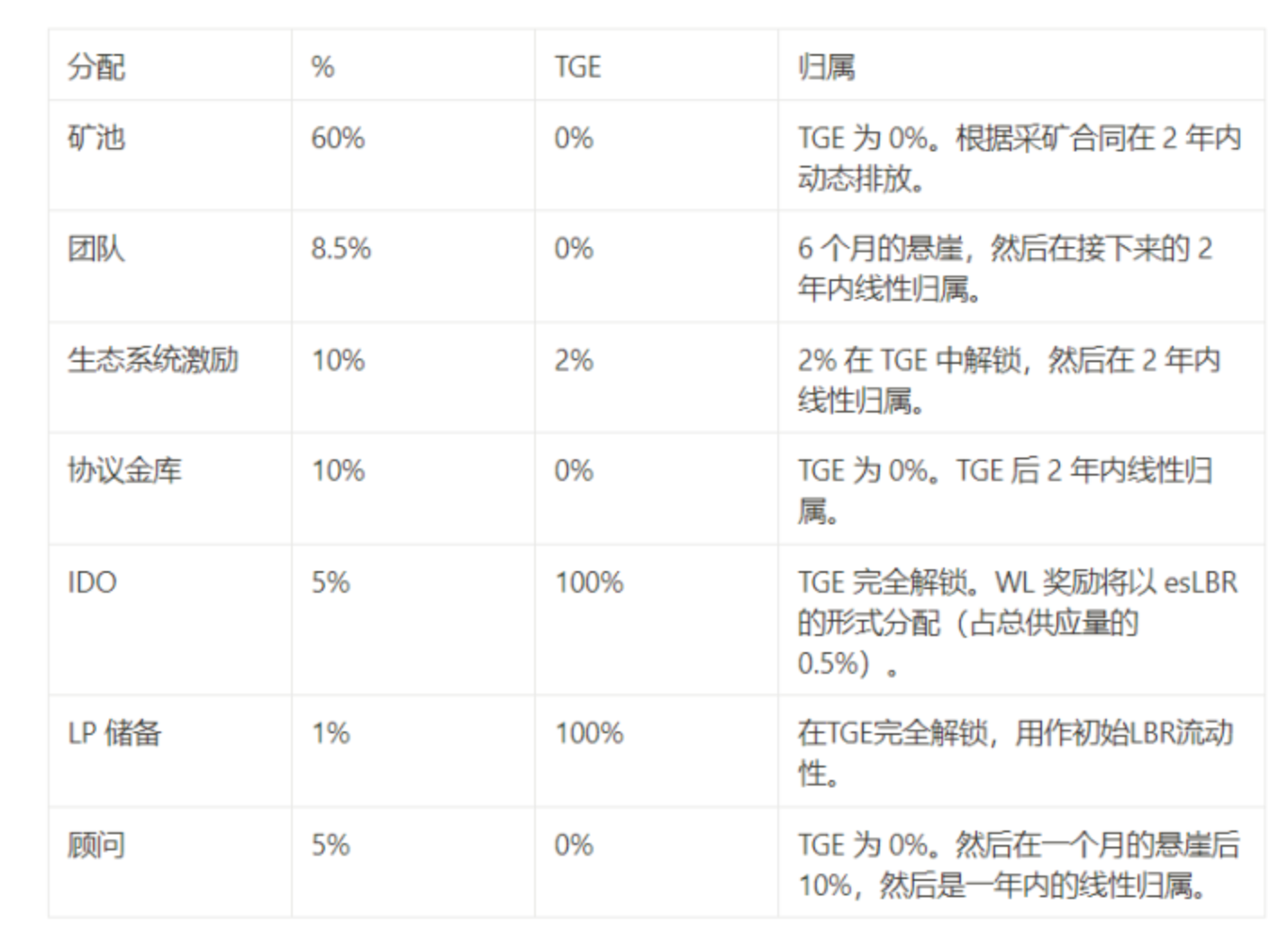 当前协议的代币 LBR 的分配机制为下表所示,其中 IDO 部分以 0.3U 的价格出售 5M LBR,价值为 1.5M。