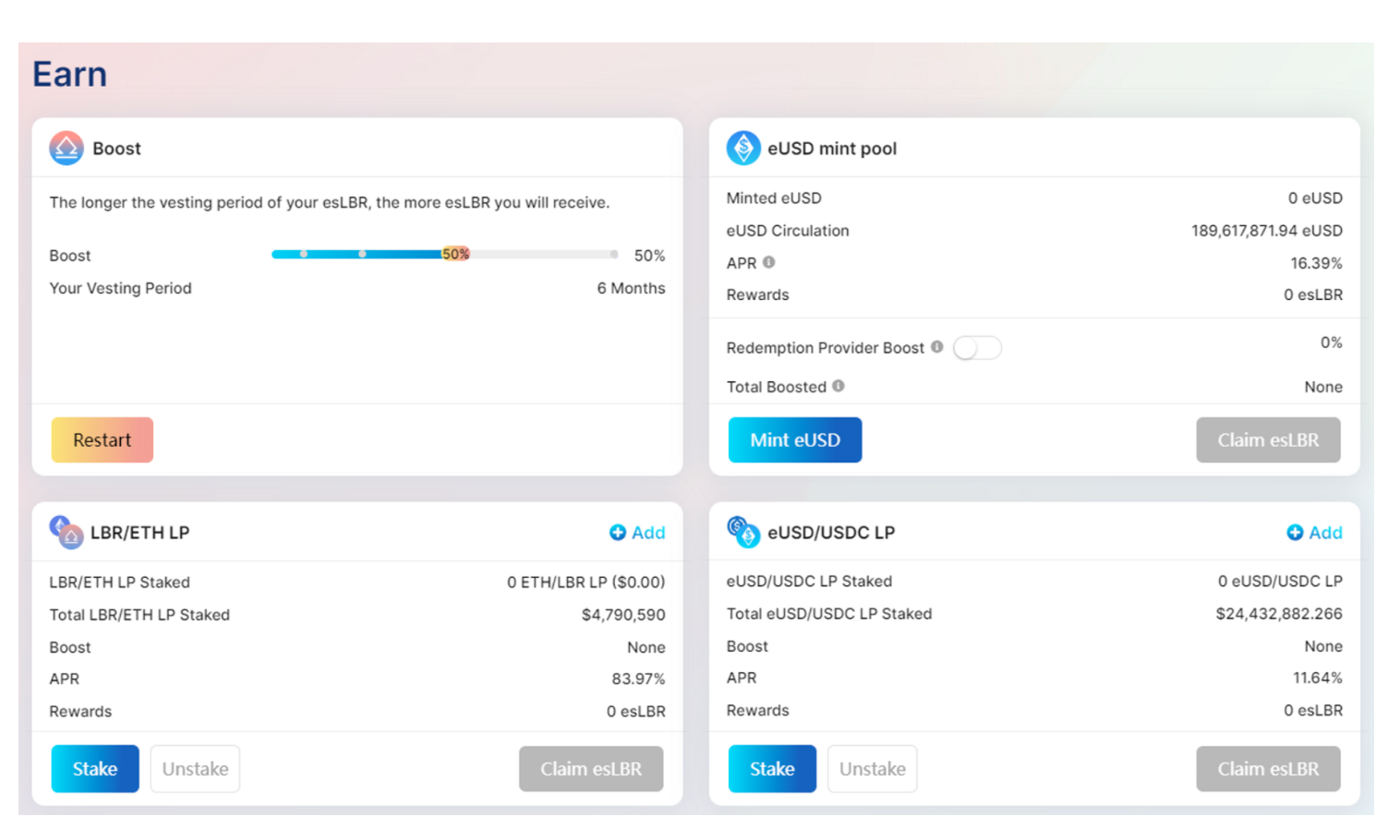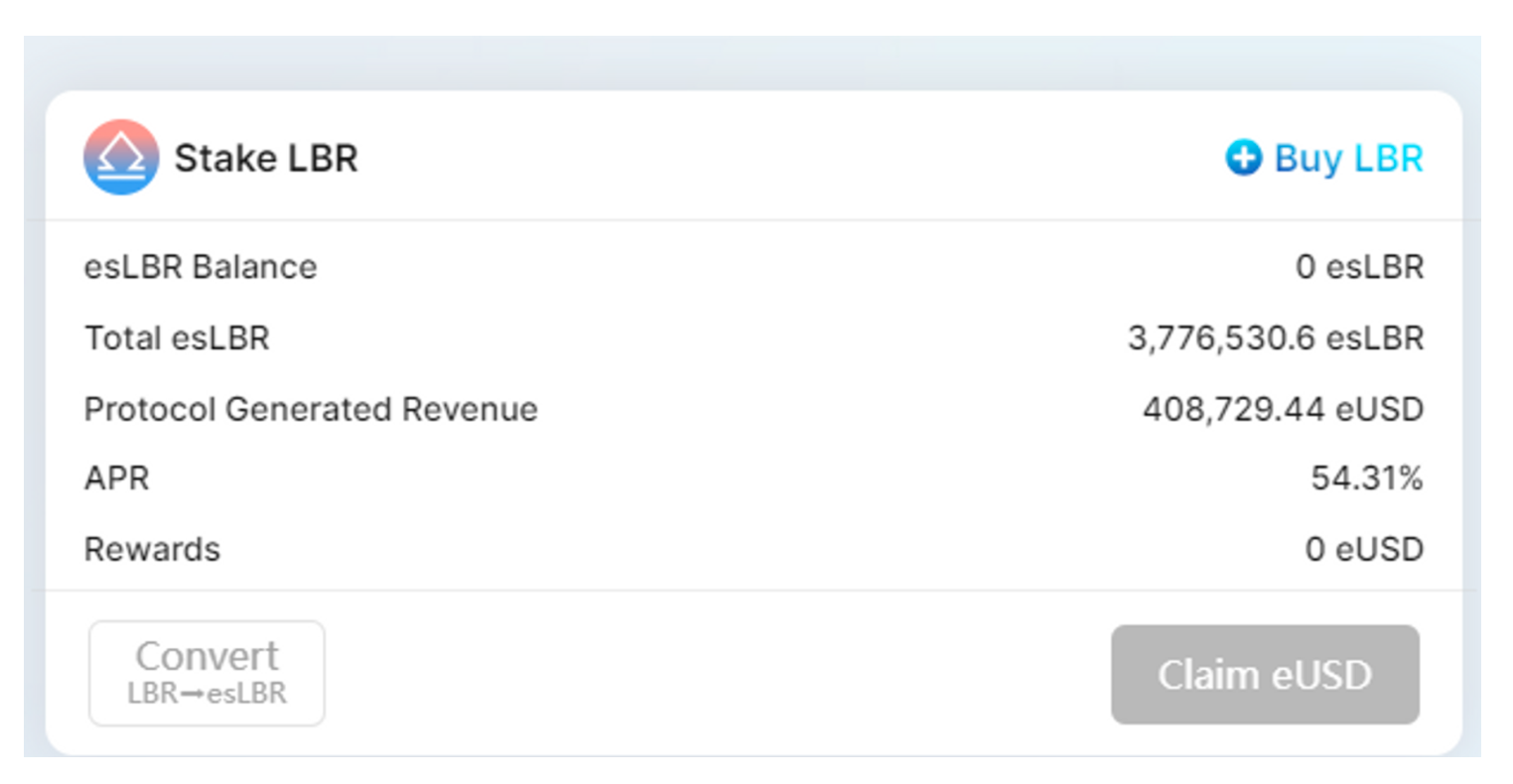 持有 eUSD 的用户需要质押资产总值的 5% 的 LBR/ETH 交易对进入 Curve 池子中来领取奖励否则暂停发放,增大 LBR 的交易深度,如果不质押 LP 会暂停释放 esLBR,且罚除的 LBR 会以折扣价格(50%)给到用户